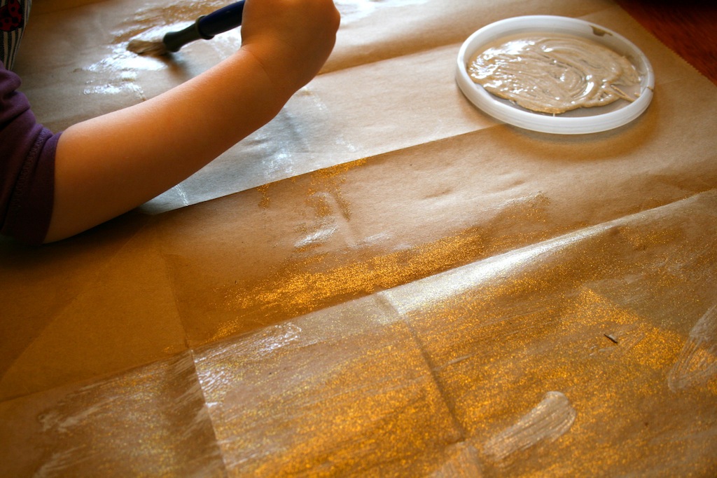 1. Cut open the paper bag and paint the plain side with the glitter. I used paint that just added gold glitter rather than paint that was an actual color. This makes the glitter and color a bit more subtle, but if you are looking for something a bit more punchy, then I think gold paint would be great. As I mentioned the other day, I was inspired by my friend Catherine's garland and she used gold paint.